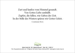 Text auf der Rückseite: Zart und lautlos vom Himmel gesandt. Von Gottes Liebe umhüllt. Zapfen, die fallen, wie Gaben der Zeit. In der Stille des Winters spüren wir Gottes Geleit.