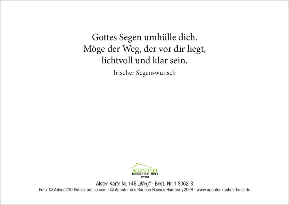 Text auf der Rückseite: Gottes Segen umhülle dich. Möge der Weg, der vor dir liegt, lichtvoll und klar sein.